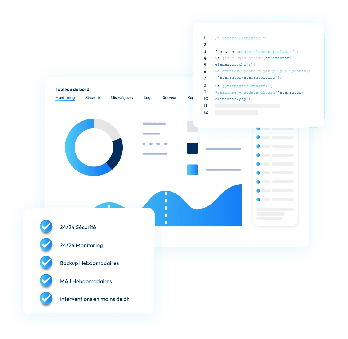Je veille sur la santé de votre site web en assurant une maintenance régulière et des mises à jour, pour une performance optimale et une tranquillité d’esprit totale.